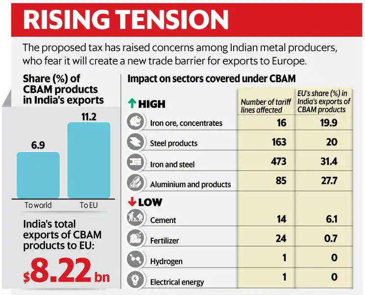 • India, being among the top eight countries adversely affected by CBAM, faces potential challenges as it exports 27% of its iron, steel, and aluminium products worth $8.2 billion to the EU, and key sectors like steel may be significantly impacted.